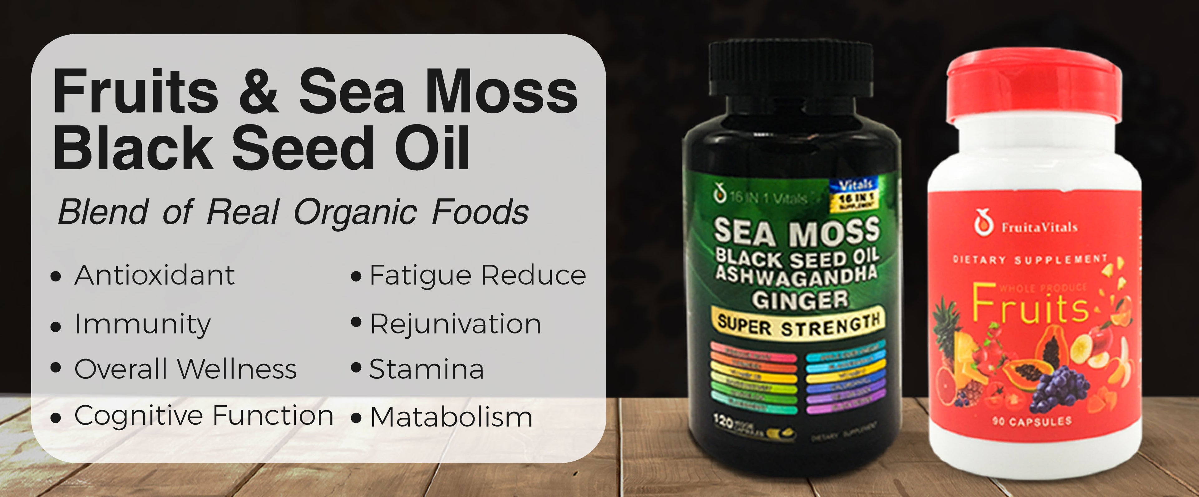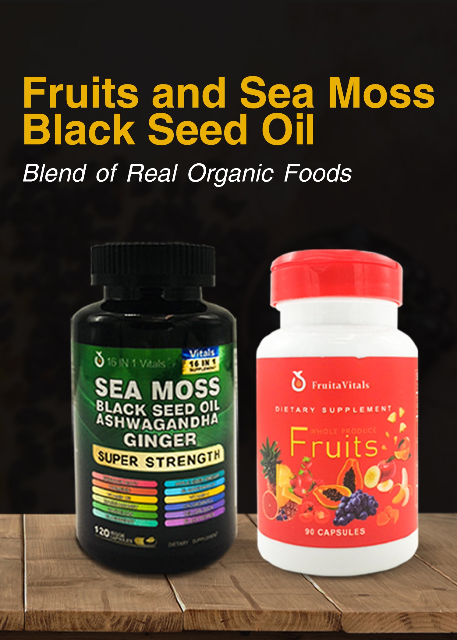 Sea Moss, Black Seed Oil, Ashwagandha, Ginger & FruitaVitals Fruits Supplements Combo (Pack of 2)