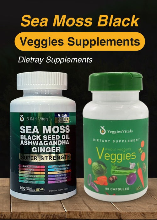 Give your body the nutritional edge it deserves with the VitalsSupport Combo a premium blend of Sea Moss, Black Seed Oil, Ashwagandha, Ginger vegetable-based supplements. This combination is carefully crafted to deliver the natural benefits of time-tested superfoods that support your energy, focus immune system.